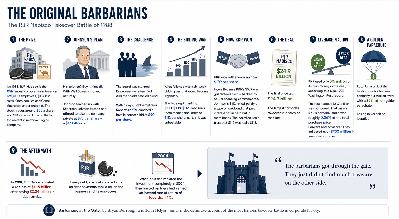 Within days, Kohlberg Kravis Roberts (KKR), the private equity firm that had essentially invented the modern LBO, launched a hostile counter-bid at $90 per share. What followed was a six-week bidding war that Bryan Burrough and John Helyar later immortalized in their book Barbarians at the Gate.