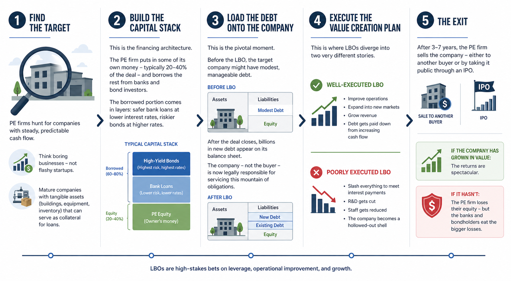 Step 5: The exit. After 3-7 years, the PE firm sells the company - either to another buyer or by taking it public through an IPO. If the company has grown in value, the returns are spectacular. If it hasn't, the PE firm loses their equity - but the banks and bondholders eat the bigger losses.